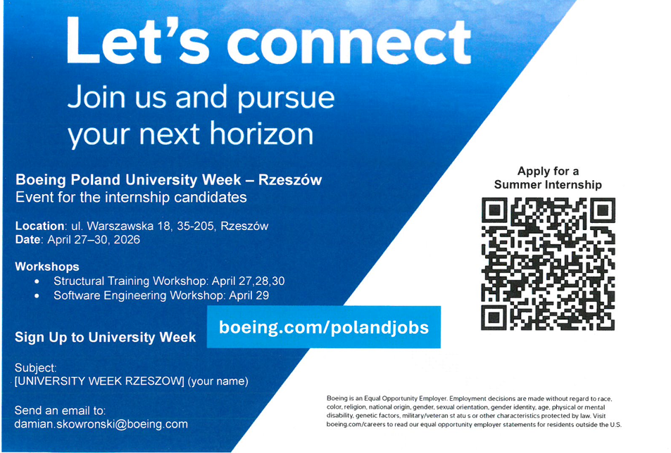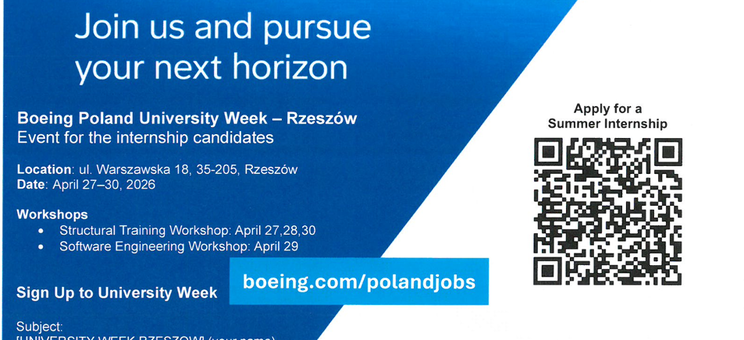 Boeing Poland organizuje spotkanie dla studentów zainteresowanych możliwością współpracy oraz realizacją staży w firmie Boeing Poland. Szczegóły oraz link do rejestracji na dołączonym plakacie
