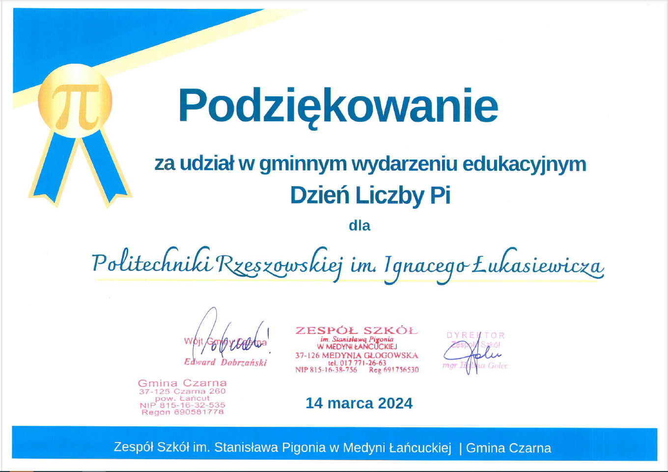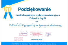 W tym roku na zaproszenie Zespołu Szkół im. Stanisława Pigonia w Medyni Łańcuckiej uczestniczyliśmy w gminnych obchodach Dnia Liczby Pi w Gminie Czarna. Dr inż. Robert Jakubowski i dr inż. Daniel Lichoń zaprezentowali tematykę lotniczą, która cieszyła się dużym zainteresowaniem wśród dzieci i młodzieży. Szczególne wzięcie miały pokazy praktyczne demonstrowane na małych aparatach latających i modelach silników lotniczych.