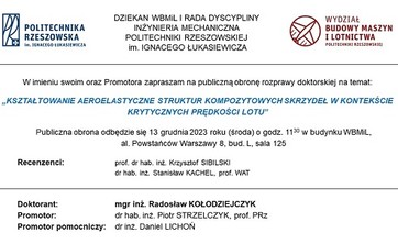 Katedra Inżynierii Lotniczej i Kosmicznej zaprasza na publiczną obronę rozprawy doktorskiej naszego pracownika mgr inż. Radosława KOŁODZIEJCZYKA, która odbędzie się w dniu 13.12.2023 (środa)