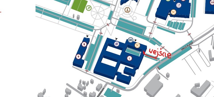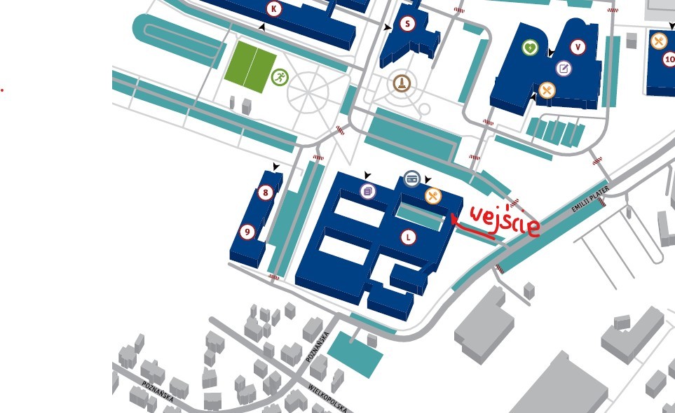 Informuję, że w dniu 11 i 12 maja będzie ograniczony dostęp do budynku L. Jest to związane z odbywającymi się Juwenaliami. Nie będzie dostępu przez główne wejścia do budynku. Jedyne dostępne wejście będzie od ul. Emilii Plater zgodnie z planem zaznaczonym na rysunku.