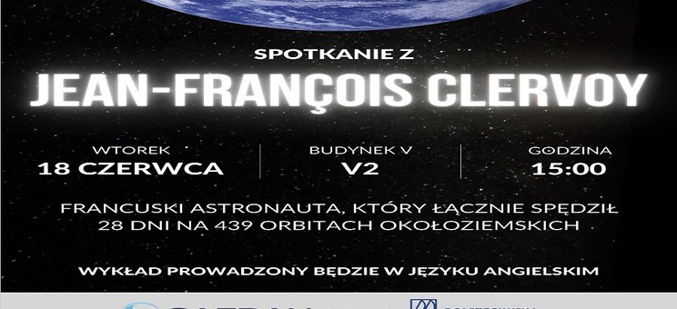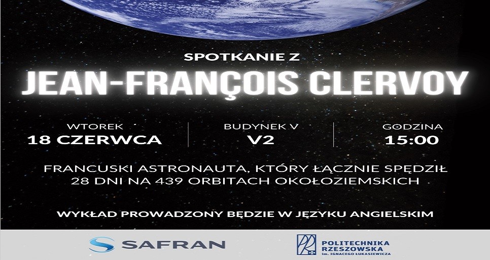 Serdecznie zapraszamy na spotkanie z francuskim astronautą Jean-Francois Clervoy, które odbędzie się 18-go czerwca br. (wtorek) w budynku V Politechniki Rzeszowskiej w auli V2. Początek spotkania o godzinie 15:00. Spotkanie będzie prowadzone w języku angielskim.