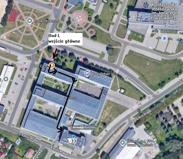 Plan dojścia do bud L33 pokazano na mapie. Wchodzimy głównym wejściem do bud. L (aleja Powstańców Warszawy 8), następnie klatką schodową na 1 piętro, z klatki skręcamy w prawo i kierujemy się korytarzem do końca, tam skręcamy w prawo i dalej korytarzem do końca gdzie skręcamy w lewo do bud L33. (Można skorzystać z aplikacji na telefon do nawigacji po budynku L, która jest dostępna na stronie: Nawigacja po budynku „L” / Wydział Budowy Maszyn i Lotnictwa (prz.edu.pl))