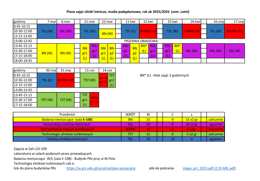 Plan zajęć dla studiów podyplomowych Silniki Lotnicze edycja 16 sem. zimowy 2025/2026 (dokument do pobrania w wersji PDF)